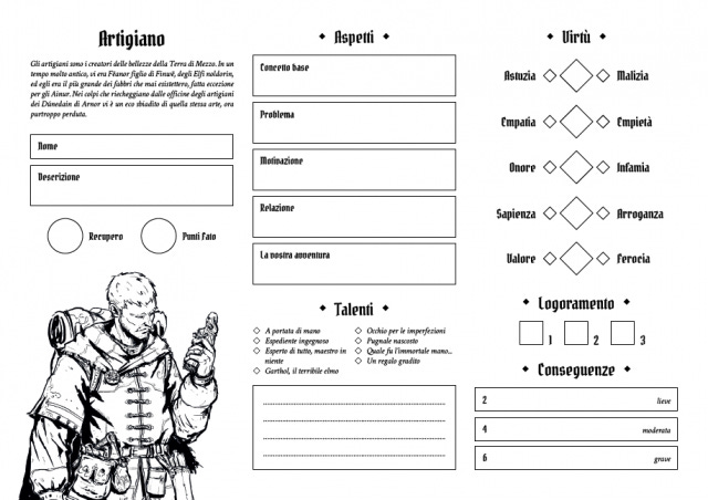E così, anche noi, come quel mazziere, sveliamo le nostre prime “tre carte” di Tirnath-en-Êl Annûn: le schede dei personaggi dei giocatori (con ciascuno dei sei archetipi che i giocatori possono scegliere) e le schede riassuntive dei talenti (che riportano solo le regole, senza i fronzoli colorati, ma necessari a catturare la giusta atmosfera, che troverete nel manuale), tutte impaginate dal nostro bellissimo Antonio Amato.